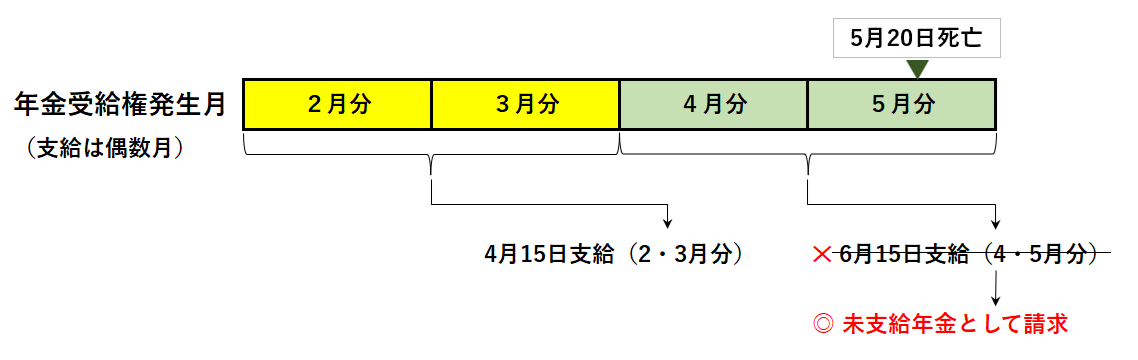 4月分と5月分の年金は、本人へ支払うことができないため未支給年金となります。そのため、生計同一の親族が未支給年金を請求することになります。
